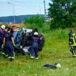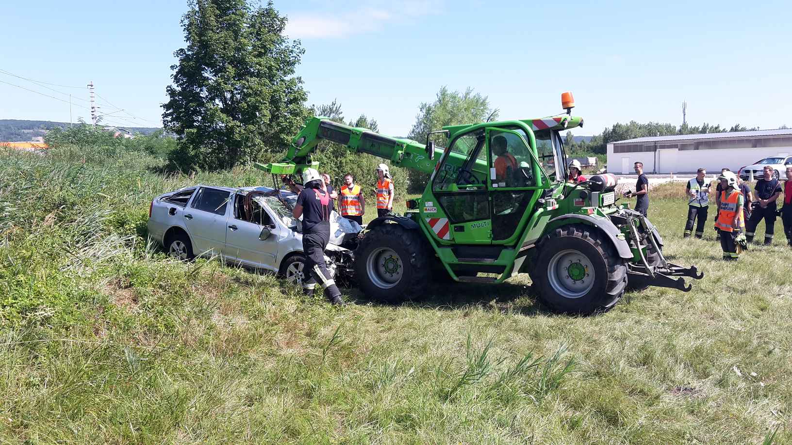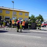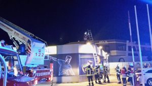 Den praktischen Teil der Inspizierung bildete eine Brandeinsatzübung im erst kürzlich erweiterten Autohaus Denzel im Gewerbegebiet. Da der Alarmierungstext „Kellerbrand im Reifenlager des Autohauses Denzel – eine Person vermisst“ lautete, rückte die Einsatzmannschaft mit allen Fahrzeugen zum Brandeinsatz aus.