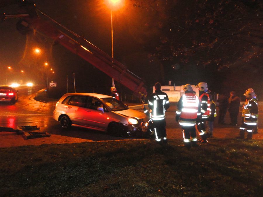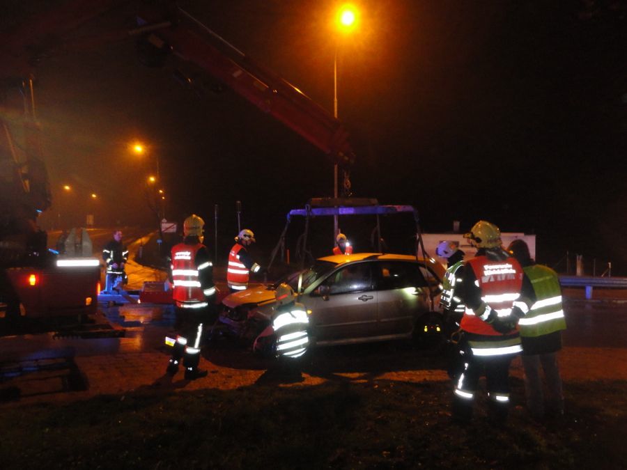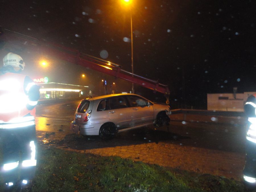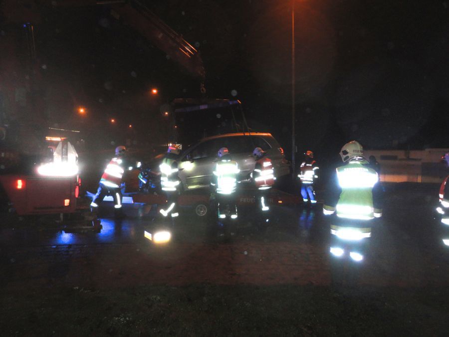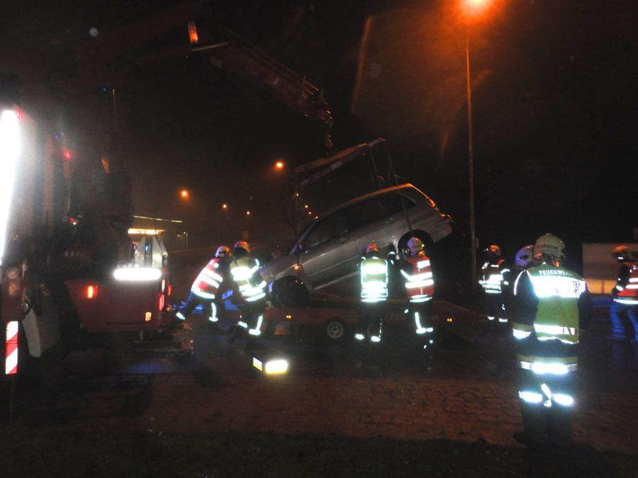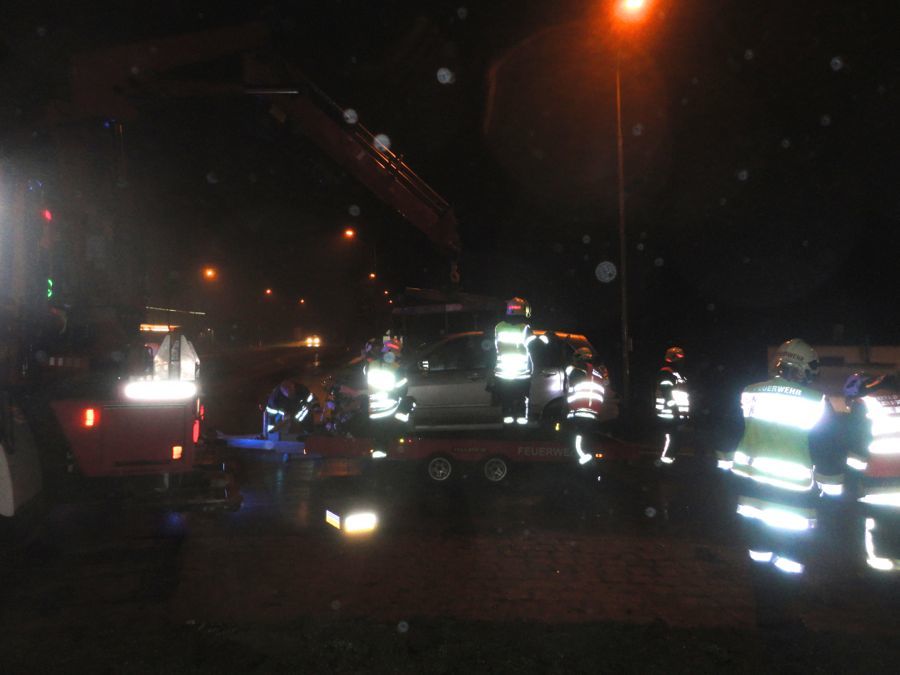 Von der Stadtfeuerwehr wurde das Fahrzeug mittels Seilwinde geborgen und auf den Abschleppanhänger verladen. Anschließend wurde noch eine Ölspur beseitig.